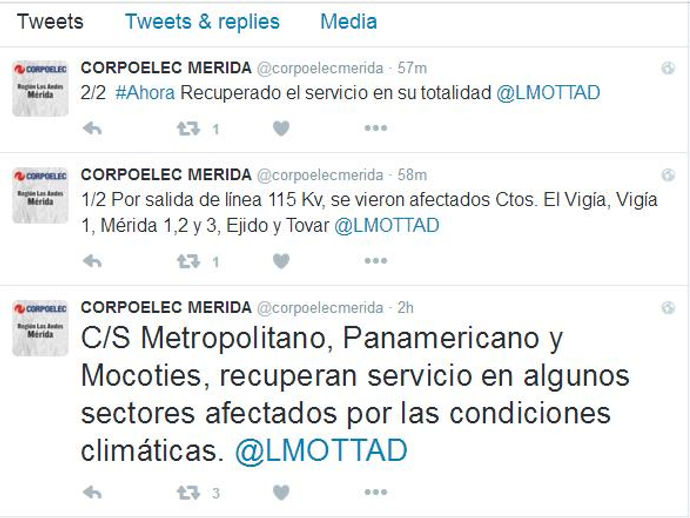 Merideños reportaron que estuvieron sin energía eléctrica al menos 40 minutos en varios municipios del estado Mérida En horas de la...